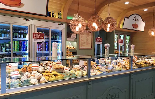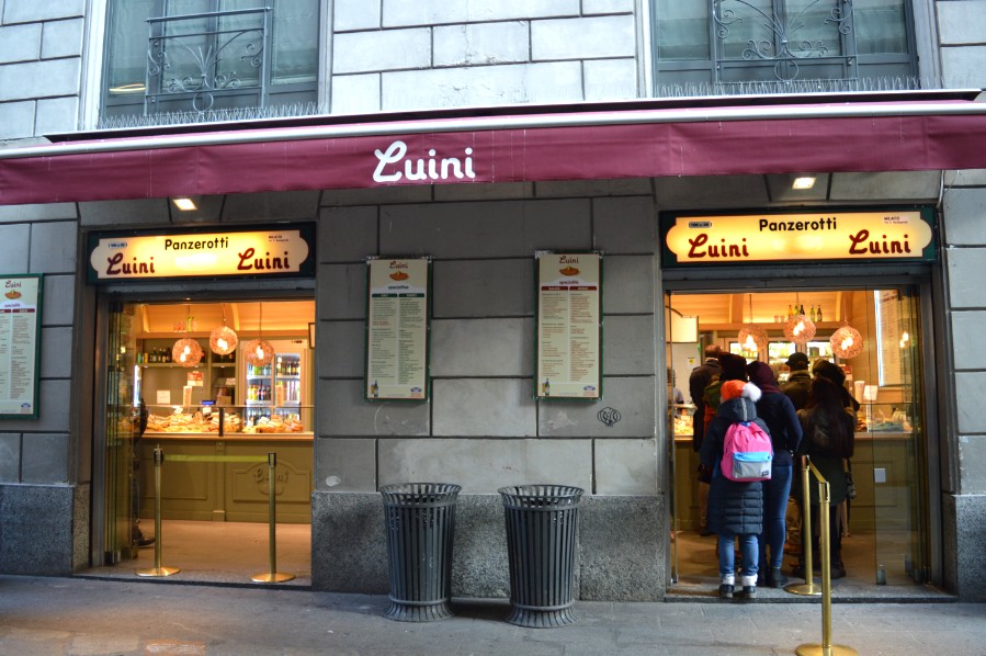 Tuż przy katedrze, dosłownie kilkadziesiąt metrów od Duomo, znajduje się jeden z najsłynniejszych punktów street foodowych w Mediolanie. Lokal działa nieprzerwanie od 1949 roku i od dekad prowadzony jest przez tę samą rodzinę. Nie ma tu stolików ani eleganckiej obsługi — to klasyczne miejsce „na szybko”, gdzie zamawia się przy okienku i je w biegu albo na stojąco przy pobliskim murku. Mimo to, a może właśnie dlatego, uchodzi za kulinarną instytucję miasta i kosztuje około 3€ w zależności od tego z czym weźmiesz.